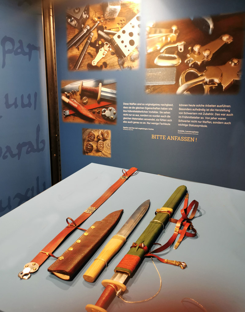 Die Waffen sind idealtypisch mit Bezügen zu Funden aus NRW (Pyramidenknöpfe aus Bergkamen, Saxniete aus Balhorn und der leichte Anachronismus in der Zusammenstellung).